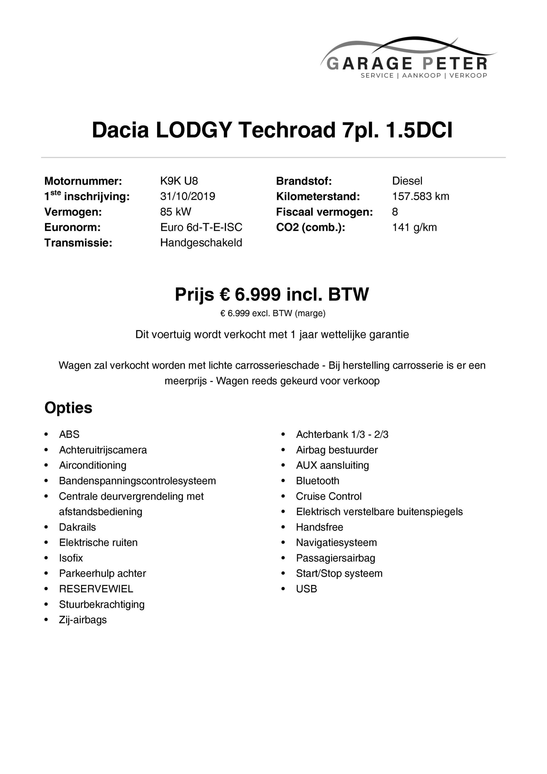 Deze ruime en praktische Dacia Lodgy Techroad 1.5 DCI is de ideale gezinswagen of werkpartner. Met zijn 7 zitplaatsen, zuinige dieselmotor en uitgebreide uitrusting combineert deze wagen comfort met functionaliteit.