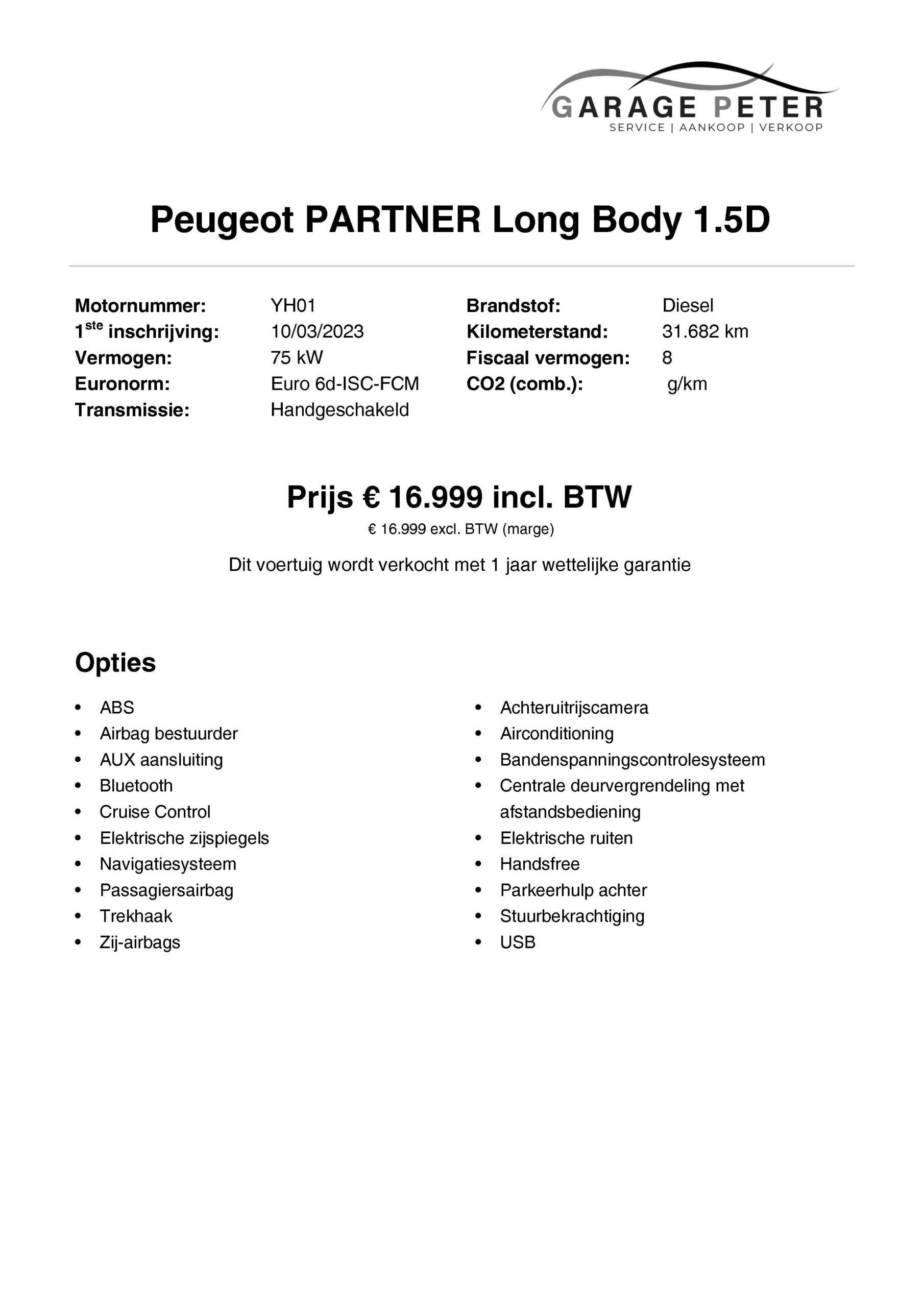 Peugeot Partner Long Body 1.5 Diesel 2023 | 31.682 km | Lichte vracht | Garage Peter Bredene